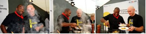 Inzwischen wird in Potsdam der Feierabend eingeläutet. Reggae-Klänge schallen aus den Lautsprechern des großen Kochzeltes auf dem Luisenplatz. Auch die musikalische Untermalung muss schließlich stimmen. Also auf zu Runde drei der Kochkünste vom heutigen Tage. Wobei eines auffällt: Die Köche sind heute besonders charmant, so, als ob sie das triste Grau des Tages vergessen machen wollen.