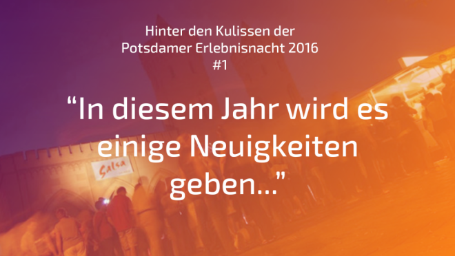Vor fast 12 Jahren haben wir mit viel Euphorie, einer Menge Ehrgeiz, tollen Helfern und einer kleinen Portion Glück die erste Potsdamer Erlebnisnacht auf die Beine stellen können. Seitdem ist viel passiert: Erlebnisnächte bei jedem Wetter, ob Sonne oder Wind und Regen, haben diese Veranstaltung zum größten Straßenfest der Region wachsen lassen. Dafür sagen wir erst einmal Danke!